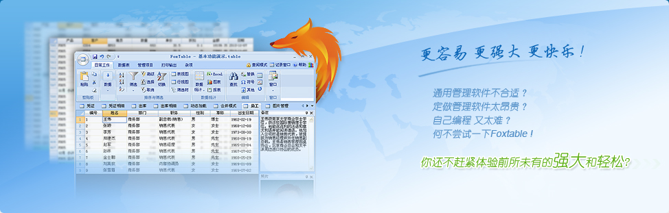 Foxtable不僅是一個優(yōu)秀的應(yīng)用軟件,同時(shí)又是一個高效率的開發(fā)工具,幾乎人人都能掌握。普通人也能開發(fā)出讓資深程序員目瞪口呆的軟件,不再是天方夜譚。